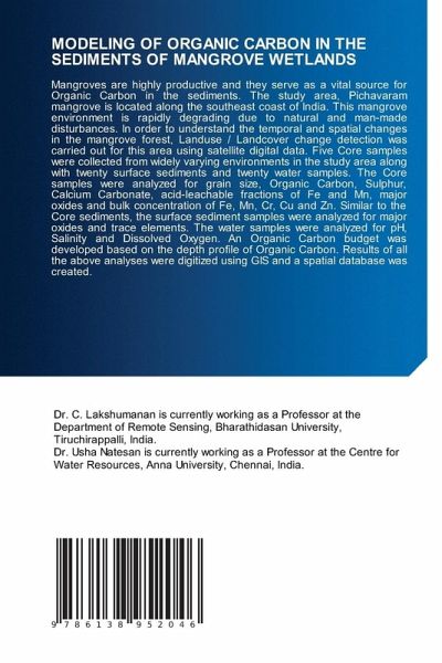 Mangroves are highly productive and they serve as a vital source for Organic Carbon in the sediments. The study area, Pichavaram mangrove is located along the southeast coast of India. This mangrove environment is rapidly degrading due to natural and man-made disturbances. In order to understand the temporal and spatial changes in the mangrove forest, Landuse / Landcover change detection was carried out for this area using satellite digital data. Five Core samples were collected from widely varying environments in the study area along with twenty surface sediments and twenty water samples. The Core samples were analyzed for grain size, Organic Carbon, Sulphur, Calcium Carbonate, acid-leachable fractions of Fe and Mn, major oxides and bulk concentration of Fe, Mn, Cr, Cu and Zn. Similar to the Core sediments, the surface sediment samples were analyzed for major oxides and trace elements. The water samples were analyzed for pH, Salinity and Dissolved Oxygen. An Organic Carbon budget was developed based on the depth profile of Organic Carbon. Results of all the above analyses were digitized using GIS and a spatial database was created.