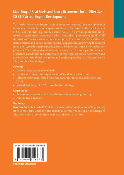 To drastically reduce the emission of greenhouse gases, the development of future internal combustion engines will be strictly linked to the development of CO 2 neutral fuels (e.g. biofuels and e-fuels). This evolution implies an increase in development complexity, which needs the support of engine 3D-CFD simulations. Francesco Cupo presents approaches to accurately describe fuel characteristics and knock occurrence in SI engines, thus improving the current simulation capability in investigating alternative fuels and innovative combustion processes. The developed models are successfully used to investigate the influence of ethanol-based fuels and water injection strategies on knock occurrence and to conduct a virtual fuel design for and engine operating with the innovative SACI combustion strategy.