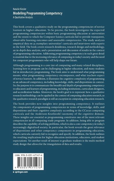 The book provides new insights into programming competency. It outlines the components of programming competencies in terms of knowledge, skills, and dispositions and their cognitive complexity according to the CC2020 computing curricula and the Anderson-Krathwohl taxonomy of the cognitive domain. These insights are essential as programming constitutes one of the most relevant competencies in all computing study programs. In addition, being able to program describes the capability of solving problems, which is also a core competency in today's increasingly digitalized society. In particular, the book reveals the great relevance of dispositions and other competency components in programming education, which curricula currently fail to recognize and specify. In addition, the book outlines the resulting implications for higher education institutions, educators, and student expectations. Yet another result of interest to graduate students is the multi-method study design that allows for the triangulation of data and results.