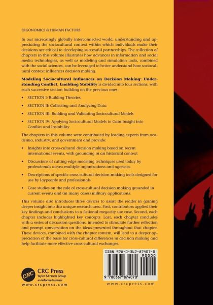 In our increasingly globally interconnected world, understanding and appreciating the sociocultural context within which individuals make their decisions is critical to developing successful partnerships. The collection of chapters in this volume illustrates how advances in information and social media technologies, as well as modeling and simulation tools, combined with the social sciences, can be leveraged to better understand how sociocultural context influences decision making. The chapters in this volume were contributed by leading experts from academia, industry, and government and provide: Insights into cross-cultural decision making based on recent international events, with grounding in an historical context Discussions of cutting-edge modeling techniques used today by professionals across multiple organizations and agencies Descriptions of specific cross-cultural decision making tools designed for use by laypeople and professionals Case studies on the role of cross-cultural decision making grounded in current events and (in many cases) military applications.