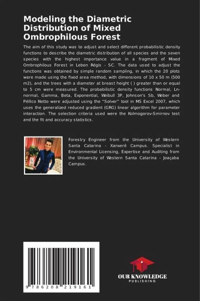 The aim of this study was to adjust and select different probabilistic density functions to describe the diametric distribution of all species and the seven species with the highest importance value in a fragment of Mixed Ombrophilous Forest in Lebon Régis - SC. The data used to adjust the functions was obtained by simple random sampling, in which the 20 plots were made using the fixed area method, with dimensions of 10 x 50 m (500 m2), and the trees with a diameter at breast height ( ) greater than or equal to 5 cm were measured. The probabilistic density functions Normal, Ln-normal, Gamma, Beta, Exponential, Weibull 3P, Johnson's Sb, Weber and Péllico Netto were adjusted using the "Solver" tool in MS Excel 2007, which uses the generalized reduced gradient (GRG) linear algorithm for parameter interaction. The selection criteria used were the Kolmogorov-Smirnov test and the fit and accuracy statistics.