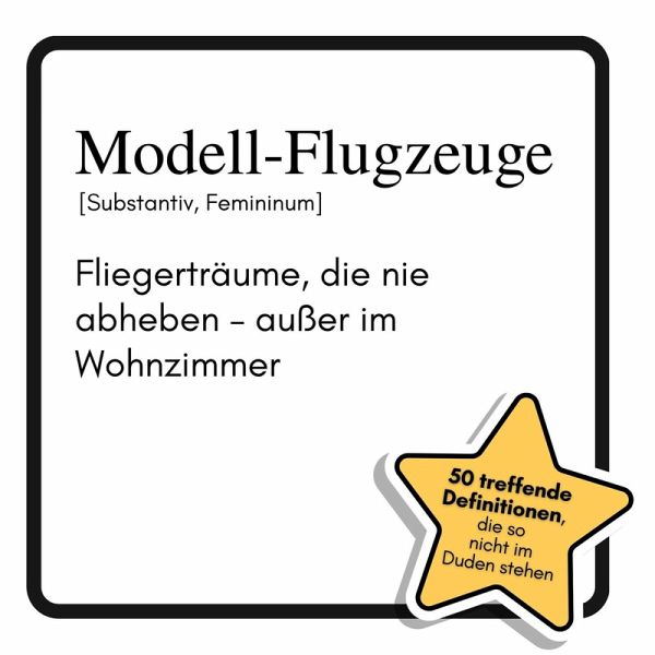 Achtung, hier hebt der Spaß ab - und zwar direkt zwischen Couchtisch und Bücherregal! "Modell-Flugzeuge: Fliegerträume, die nie abheben - außer im Wohnzimmer" nimmt die Welt der Miniaturflieger mit einer Prise Ironie und einer ordentlichen Portion Bastelchaos aufs Korn. Wer wissen will, warum Sekundenkleber und Balsaholz die wahren Helden des Hobbys sind, findet hier die Antwort - samt liebevoll gezeichneter Illustrationen.Für wen dieses Buch perfekt ist:- Für Modellflug-Fans mit Humor und Bastelleidenschaft- Für alle, die schon mal einen Propeller im Wohnzimmer gesucht haben- Für Geschenksuchende mit Sinn für originelle Hobbys50 witzige Definitionen, von der Depronplatte bis zum Akkuquäler, zeigen, wie viel Herzblut, Improvisation und Selbstironie im Modellflug stecken. Ein Buch, das Bastelkeller und Wohnzimmerpiste gleichermaßen feiert - und dabei garantiert für Lacher sorgt.Was dieses Buch bietet:- 50 humorvolle Definitionen rund ums Modellfliegen- Passende Illustrationen zu jedem Begriff- Ideales Geschenk für Modellbauer und Flugzeugfans- Ein liebevoller Blick auf die kleinen Dramen und großen Triumphe des Hobbys