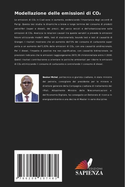 Le emissioni di CO¿ in Ciad sono in aumento, evidenziando l'importanza degli accordi di Parigi. Questa tesi studia le dinamiche a breve e lungo termine del consumo di prodotti petroliferi (super e diesel), dei prezzi, del parco veicoli e dell'urbanizzazione sulle emissioni di CO¿. Analizza le relazioni causali tra queste variabili e prevede le emissioni future utilizzando modelli ARDL, test di stazionarietà, bounds test e test di causalità di Granger. I risultati mostrano che un aumento dell'1% del consumo di carburante super porta a un aumento dell'1,03% delle emissioni di CO¿, con una causalità unidirezionale. Per il diesel, l'impatto è positivo ma non significativo, con causalità bidirezionale. Le previsioni indicano che le emissioni raggiungeranno 2672,39 chilotonnellate entro il 2030. Questi risultati contribuiranno a orientare le politiche ambientali per ridurre le emissioni di CO¿ ottimizzando il consumo di carburante e controllando il consumo di diesel.