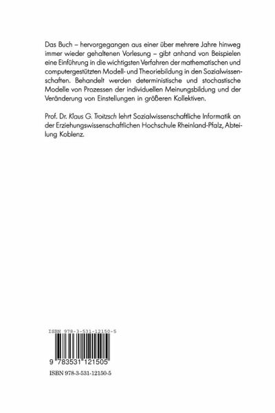 Das Buch - hervorgegangen aus einer über mehrere Jahre hinweg immer wieder gehaltenen Vorlesung - gibt anhand von Beispielen eine Einführung in die wichtigsten Verfahren der mathematischen und computergestützten Modell- und Theoriebildung in den Sozialwissenschaften. Behandelt werden deterministische und stochastische Modelle von Prozessen der individuellen Meinungsbildung und der Veränderung von Einstellungen in größeren Kollektiven.