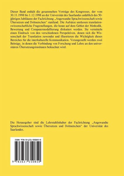 Dieser Band enthält die gesammelten Vorträge des Kongresses, der vom 30.11.1998 bis 1.12.1998 an der Universität des Saarlandes anläßlich des 50-jährigen Jubiläums der Fachrichtung "Angewandte Sprachwissenschaft sowie Übersetzen und Dolmetschen" stattfand. Die Aufsätze umfassen translationswissenschaftliche Fragestellungen, die heute auf dem Gebiet der Methodik, Bewertung und Computermodellierung diskutiert werden. Sie vermitteln einen Eindruck von den verschiedenen Perspektiven, denen sich die Wissenschaft der Translation zuwendet und illustrieren die Wichtigkeit dieses Bereichs für die interkulturelle Kommunikation. Vorangestellt werden zwei Beiträge, in denen die Verbindung von Forschung und Lehre an den universitären Übersetzungsinstituten beleuchtet wird.