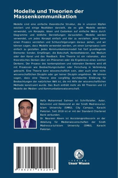 Modelle sind eine einfache theoretische Struktur, die in unseren Köpfen existiert und einige Realitäten darstellt, die es gibt. Modelle werden verwendet, um Konzepte, Ideen und Gedanken auf einfache Weise durch Diagramme und bildliche Darstellungen darzustellen. Modelle werden verwendet, um jedes Konzept einfach und klar zu verstehen. Jeder kann einen Prozess verstehen und Schlussfolgerungen daraus ziehen, und wir können sagen, dass Modelle verwendet werden, um einen Lernprozess sehr einfach zu gestalten. Jedes Kommunikationsmodell hat fünf grundlegende Elemente: Sender, Empfänger, die Botschaft, Kontextfaktoren, das Medium oder den Kanal und das Feedback. Eine Theorie ist ein rationales, also theoretisches Denken über ein Phänomen oder die Ergebnisse eines solchen Denkens. Der Prozess des kontemplativen und rationalen Denkens wird oft mit Prozessen wie Beobachtungsstudien oder Forschung in Verbindung gebracht. Eine Theorie kann wissenschaftlich sein, aber auch einer nicht-wissenschaftlichen Disziplin oder gar keiner Disziplin angehören. Wir können sagen, dass eine Theorie eine sorgfältig durchdachte Erklärung für Beobachtungen der natürlichen Welt ist, die mit Hilfe der wissenschaftlichen Methode konstruiert wurde. Das Buch enthält mehr als 60 Theorien und 12 Modelle der Medien- und Kommunikationswissenschaft.