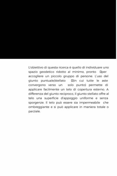 L'obiettivo di questa ricerca è quello di individuare uno spazio geodetico ridotto al minimo, ottimizzato per accogliere un piccolo gruppo di persone. L'uso del giunto puntuale/stellato (in cui tutte le aste convergono verso un solo punto), permette di applicare facilmente un telo di copertura esterno. A differenza del giunto reciproco, il giunto stellato offre al telo una superficie d'appoggio uniforme e senza sporgenze.Il telo può essere sia impermeabile che ombreggiante, e si può applicare in maniera totale o parziale.