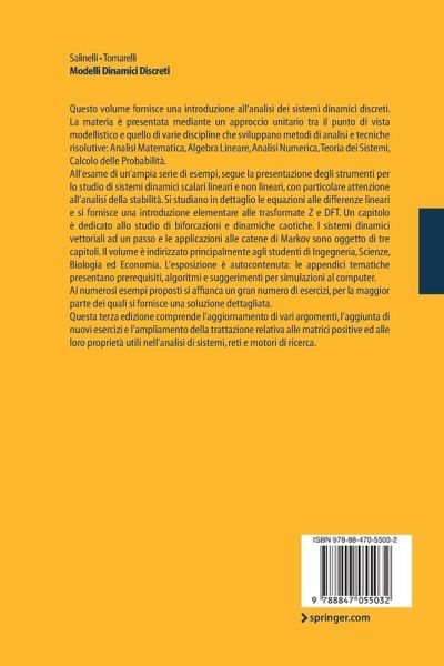 Questo volume fornisce una introduzione all'analisi dei sistemi dinamici discreti. La materia è presentata mediante un approccio unitario tra il punto di vista modellistico e quello di varie discipline che sviluppano metodi di analisi e tecniche risolutive: Analisi Matematica, Algebra Lineare, Analisi Numerica, Teoria dei Sistemi, Calcolo delle Probabilità. All'esame di un'ampia serie di esempi, segue la presentazione degli strumenti per lo studio di sistemi dinamici scalari lineari e non lineari, con particolare attenzione all'analisi della stabilità. Si studiano in dettaglio le equazioni alle differenze lineari e si fornisce una introduzione elementare alle trasformate Z e DFT. Un capitolo è dedicato allo studio di biforcazioni e dinamiche caotiche. I sistemi dinamici vettoriali ad un passo e le applicazioni alle catene di Markov sono oggetto di tre capitoli. L'esposizione è autocontenuta: le appendici tematiche presentano prerequisiti, algoritmi e suggerimenti per simulazioni al computer. Ai numerosi esempi proposti si affianca un gran numero di esercizi, per la maggior parte dei quali si fornisce una soluzione dettagliata. Il volume è indirizzato principalmente agli studenti di Ingegneria, Scienze, Biologia ed Economia. Questa terza edizione comprende l'aggiornamento di vari argomenti, l'aggiunta di nuovi esercizi e l'ampliamento della trattazione relativa alle matrici positive ed alle loro proprietà utili nell'analisi di sistemi, reti e motori di ricerca.