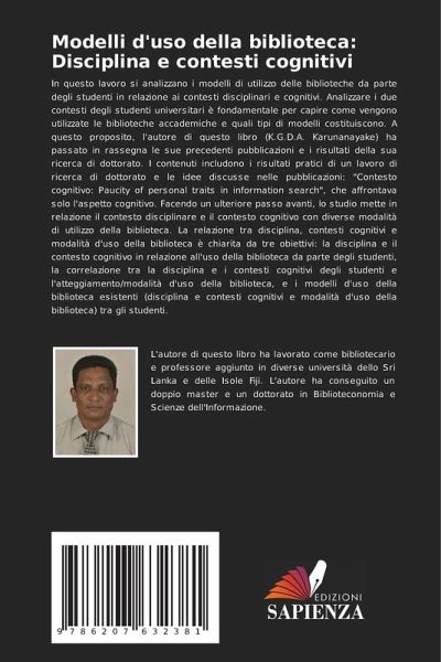 In questo lavoro si analizzano i modelli di utilizzo delle biblioteche da parte degli studenti in relazione ai contesti disciplinari e cognitivi. Analizzare i due contesti degli studenti universitari è fondamentale per capire come vengono utilizzate le biblioteche accademiche e quali tipi di modelli costituiscono. A questo proposito, l'autore di questo libro (K.G.D.A. Karunanayake) ha passato in rassegna le sue precedenti pubblicazioni e i risultati della sua ricerca di dottorato. I contenuti includono i risultati pratici di un lavoro di ricerca di dottorato e le idee discusse nelle pubblicazioni: "Contesto cognitivo: Paucity of personal traits in information search", che affrontava solo l'aspetto cognitivo. Facendo un ulteriore passo avanti, lo studio mette in relazione il contesto disciplinare e il contesto cognitivo con diverse modalità di utilizzo della biblioteca. La relazione tra disciplina, contesti cognitivi e modalità d'uso della biblioteca è chiarita da tre obiettivi: la disciplina e il contesto cognitivo in relazione all'uso della biblioteca da parte degli studenti, la correlazione tra la disciplina e i contesti cognitivi degli studenti e l'atteggiamento/modalità d'uso della biblioteca, e i modelli d'uso della biblioteca esistenti (disciplina e contesti cognitivi e modalità d'uso della biblioteca) tra gli studenti.