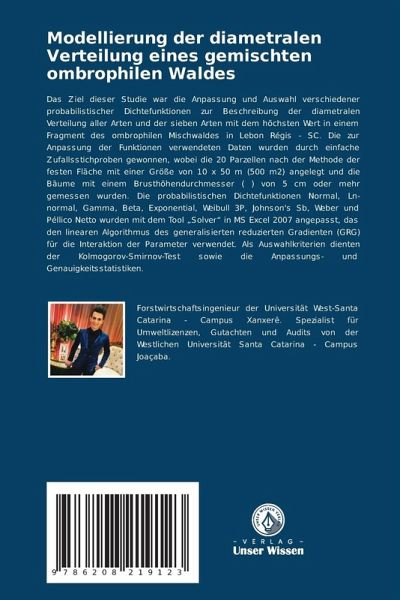 Das Ziel dieser Studie war die Anpassung und Auswahl verschiedener probabilistischer Dichtefunktionen zur Beschreibung der diametralen Verteilung aller Arten und der sieben Arten mit dem höchsten Wert in einem Fragment des ombrophilen Mischwaldes in Lebon Régis - SC. Die zur Anpassung der Funktionen verwendeten Daten wurden durch einfache Zufallsstichproben gewonnen, wobei die 20 Parzellen nach der Methode der festen Fläche mit einer Größe von 10 x 50 m (500 m2) angelegt und die Bäume mit einem Brusthöhendurchmesser ( ) von 5 cm oder mehr gemessen wurden. Die probabilistischen Dichtefunktionen Normal, Ln-normal, Gamma, Beta, Exponential, Weibull 3P, Johnson's Sb, Weber und Péllico Netto wurden mit dem Tool "Solver" in MS Excel 2007 angepasst, das den linearen Algorithmus des generalisierten reduzierten Gradienten (GRG) für die Interaktion der Parameter verwendet. Als Auswahlkriterien dienten der Kolmogorov-Smirnov-Test sowie die Anpassungs- und Genauigkeitsstatistiken.