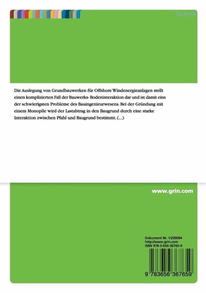 Masterarbeit aus dem Jahr 2010 im Fachbereich Ingenieurwissenschaften - Geotechnik, Note: 1,0, Hochschule Bremen (Fraunhofer - Hochschule Bremen/ Institut Geotechnik Bremen), Sprache: Deutsch, Abstract: Die Auslegung von Grundbauwerken für Offshore Windenergieanlagen stellt einen komplizierten