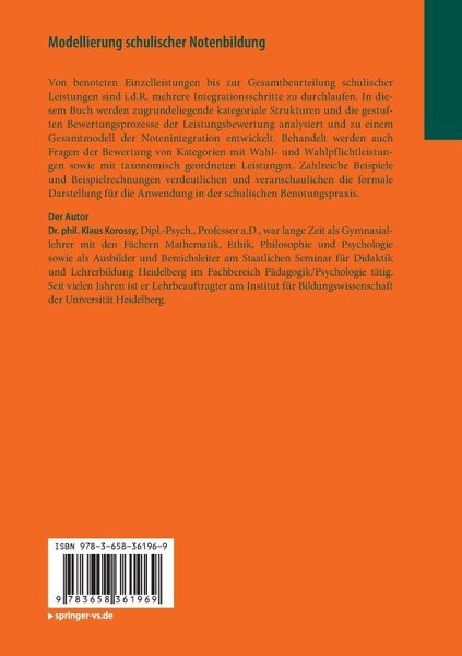 Einleitung: Kontext, Intention, Gliederung.-Kategorien und Grundstrukturen der Notenbildun.-Kategorien und Notenbilde.-Grundmodell der hierarchischen Notenintegration.-Bewertung von Elementarleistungs-Kategorien.-Die allgemeine (reine) Kategorienbewertung.Kategorienbewertung mit notenbildspezifischen Parameten.-Bewertungsmodelle in der gestuftenNotenintegration.-Pflicht-, Wahlpflicht-und Wahlkategorien.-Bewertung in Taxonomie.-Rückblick und Zusammenfassung.