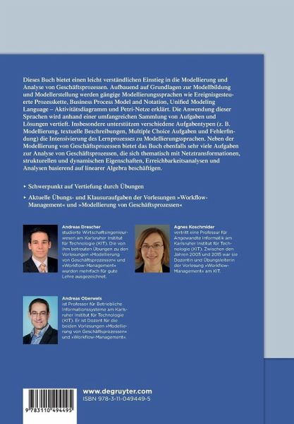 Buch bietet einen leicht verständlichen Einstieg in die Modellierung und Analyse von Geschäftsprozessen. Aufbauend auf Grundlagen zur Modellbildung und Modellerstellung werden gängige Modellierungssprachen wie Ereignisgesteuerte Prozesskette, Business Process Model and Notation, Unified Modeling Language-Aktivitätsdiagramm und Petri-Netze erklärt. Die Anwendung dieser Sprachen wird anhand einer umfangreichen Sammlung von Aufgaben und Lösungen vertieft. Insbesondere unterstützen verschiedene Aufgabentypen (z. B. Modellierung, textuelle Beschreibungen, Multiple Choice Aufgaben und Fehlerfindung) die Intensivierung des Lernprozesses zu Modellierungssprachen. Neben der Modellierung von Geschäftsprozessen bietet das Buch ebenfalls sehr viele Aufgaben zur Analyse von Geschäftsprozessen, die sich thematisch mit Netztransformationen, strukturellen und dynamischen Eigenschaften, Erreichbarkeitsanalysen und Analysen basierend auf linearer Algebra beschäftigen.