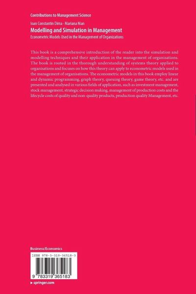 This book is a comprehensive introduction of the reader into the simulation and modelling techniques and their application in the management of organisations. The book is rooted in the thorough understanding of systems theory applied to organisations and focuses on how this theory can apply to econometric models used in the management of organisations. The econometric models in this book employ linear and dynamic programming, graph theory, queuing theory, game theory, etc. and are presented and analysed in various fields of application, such as investment management, stock management, strategic decision making, management of production costs and the lifecycle costs of quality and non-quality products, production quality Management, etc.