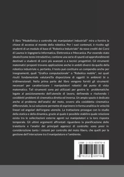 Il libro "Modellistica e controllo dei manipolatori industriali" mira a fornire la chiave di accesso al mondo della robotica. Per i suoi contenuti, è rivolto agli studenti di un modulo di base di "Robotica Industriale" da nove crediti dei Corsi di Laurea in Ingegneria Informatica, Elettronica e Meccanica. Pur essendo stato ideato come testo introduttivo, contiene una serie di spunti ed approfondimenti destinati a studenti di corsi più avanzati o a tecnici progettisti. Gli strumenti matematici proposti trovano applicazione anche in ambiti diversi da quello della robotica industriale e, pertanto, il testo può costituire un compendio anche per insegnamenti, quali "Grafica computazionale" o "Robotica mobile", nei quali risulti fondamentale valutare la disposizione di oggetti in ambienti bi o tridimensionali. Nella prima parte del libro vengono forniti gli strumenti necessari per caratterizzare i manipolatori robotici dal punto di vista matematico. Tali strumenti sono poi utilizzati per gestire le problematiche legate al posizionamento dell'utensile di lavoro, definendo e risolvendo i cosiddetti problemi di cinematica diretta ed inversa. Un ampio spazio è dedicato anche al problema dell'analisi del moto, ovvero alla cosiddetta cinematica differenziale, la cui soluzione permette di esprimere in forma analitica le velocità lineari ed angolari dell'organo utensile. La trattazione prosegue con lo studio della statica e della dinamica, grazie al quale è possibile stabilire quale relazione esista tra le sollecitazioni esterne agenti sui manipolatori e la loro risposta temporale. Gli ultimi argomenti affrontati riguardano la pianificazione delle traiettorie e l'analisi dei principali approcci di controllo: sono presi in considerazione tanto i sistemi per controllo del moto libero, che quelli per la gestione dell'interazione tra il manipolatore e l'ambiente.