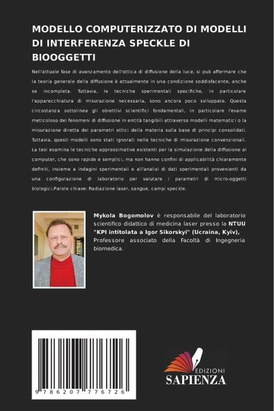 Nell'attuale fase di avanzamento dell'ottica di diffusione della luce, si può affermare che la teoria generale della diffusione è attualmente in una condizione soddisfacente, anche se incompleta. Tuttavia, le tecniche sperimentali specifiche, in particolare l'apparecchiatura di misurazione necessaria, sono ancora poco sviluppate. Questa circostanza sottolinea gli obiettivi scientifici fondamentali, in particolare l'esame meticoloso dei fenomeni di diffusione in entità tangibili attraverso modelli matematici o la misurazione diretta dei parametri ottici della materia sulla base di principi consolidati. Tuttavia, questi modelli sono stati ignorati nelle tecniche di misurazione convenzionali. La tesi esamina le tecniche approssimative esistenti per la simulazione della diffusione al computer, che sono rapide e semplici, ma non hanno confini di applicabilità chiaramente definiti, insieme a indagini sperimentali e all'analisi di dati sperimentali provenienti da una configurazione di laboratorio per valutare i parametri di micro-oggetti biologici.Parole chiave: Radiazione laser, sangue, campi speckle.