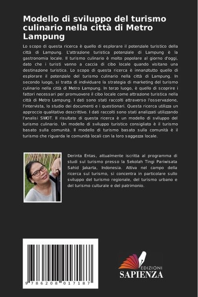 Lo scopo di questa ricerca è quello di esplorare il potenziale turistico della città di Lampung. L'attrazione turistica potenziale di Lampung è la gastronomia locale. Il turismo culinario è molto popolare al giorno d'oggi, dato che i turisti vanno a caccia di cibo locale quando visitano una destinazione turistica. Lo scopo di questa ricerca è innanzitutto quello di esplorare il potenziale del turismo culinario nella città di Lampung. In secondo luogo, si tratta di individuare la strategia di marketing del turismo culinario nella città di Metro Lampung. In terzo luogo, è quello di scoprire i fattori necessari per promuovere il cibo locale come attrazione turistica nella città di Metro Lampung. I dati sono stati raccolti attraverso l'osservazione, l'intervista, lo studio dei documenti e i questionari. Questa ricerca utilizza un approccio qualitativo descrittivo. I dati raccolti sono stati analizzati utilizzando l'analisi SWOT. Il risultato di questa ricerca è un modello di sviluppo del turismo culinario. Un modello di sviluppo turistico consigliato è il turismo basato sulla comunità. Il modello di turismo basato sulla comunità è il turismo che riguarda le comunità locali con la loro saggezza locale.