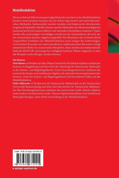 Dieses Lehrbuch führt konsequent algorithmisch orientiert in die Modellreduktion linearer zeitinvarianter Systeme ein; der Fokus liegt hierbei auf systemtheoretischen Methoden. Insbesondere werden modales und balanciertes Abschneiden eingehend behandelt. Darüber hinaus werden Methoden des Momentenabgleichs, basierend auf Krylovraumverfahren und rationaler Interpolation, diskutiert. Dabei werden alle notwendigen Grundlagen sowohl aus der Systemtheorie als auch aus der numerischen linearen Algebra vorgestellt. Die Illustration der in diesem Buch vorgestellten Verfahren der Modellreduktion, sowie einiger der notwendigen, verwendeten Konzepte aus unterschiedlichen mathematischen Bereichen, erfolgt anhand einer Reihe von numerischen Beispielen. Dazu werden die mathematische Software MATLAB® und einige frei verfügbare Software-Pakete eingesetzt, so dass alle Beispiele nachvollzogen werden können.