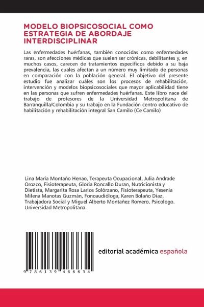 Las enfermedades huérfanas, también conocidas como enfermedades raras, son afecciones médicas que suelen ser crónicas, debilitantes y, en muchos casos, carecen de tratamientos específicos debido a su baja prevalencia, las cuales afectan a un número muy limitado de personas en comparación con la población general. El objetivo del presente estudio fue analizar cuáles son los procesos de rehabilitación, intervención y modelos biopsicosociales que mayor aplicabilidad tiene en las personas que sufren enfermedades huérfanas. Este libro nace del trabajo de profesores de la Universidad Metropolitana de Barranquilla/Colombia y su trabajo en la Fundación centro educativo de habilitación y rehabilitación integral San Camilo (Ce Camilo)