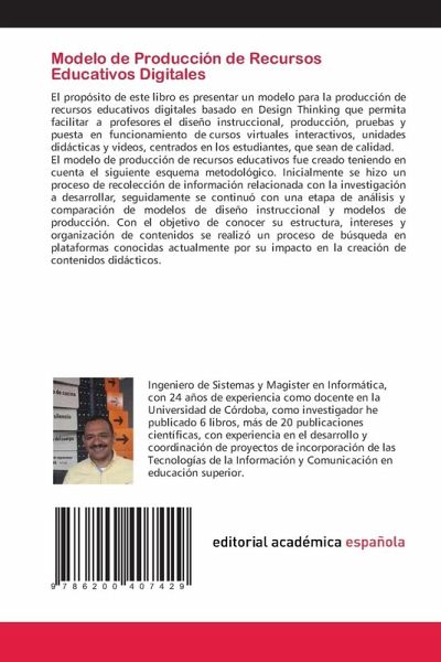 El propósito de este libro es presentar un modelo para la producción de recursos educativos digitales basado en Design Thinking que permita facilitar a profesores el diseño instruccional, producción, pruebas y puesta en funcionamiento de cursos virtuales interactivos, unidades didácticas y videos, centrados en los estudiantes, que sean de calidad. El modelo de producción de recursos educativos fue creado teniendo en cuenta el siguiente esquema metodológico. Inicialmente se hizo un proceso de recolección de información relacionada con la investigación a desarrollar, seguidamente se continuó con una etapa de análisis y comparación de modelos de diseño instruccional y modelos de producción. Con el objetivo de conocer su estructura, intereses y organización de contenidos se realizó un proceso de búsqueda en plataformas conocidas actualmente por su impacto en la creación de contenidos didácticos.