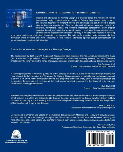 Models and Strategies for Training Design is a practical guide and reference book for instructional design professionals and students. Defining instructional design broadly, this volume describes 16 different models and strategies that can be used to create diverse learning experiences. The models and strategies represent behavioral, cognitive, humanistic, social, and affective theoretical perspectives. Each chapter supplies the origins, principles, research support, best uses, implementation steps, and the sample application of a model or strategy. A job aid guides readers in selecting appropriate models and strategies, given project requirements. Through careful selection, designers can make their instruction more effective and more appealing. A final chapter addresses special design considerations for technology-based multimedia instruction.