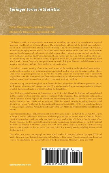 From the reviews: "Strengths of this book include its breadth of topics, excellent organization and clarity of writing...I highly recommend this book to my colleagues and students." -Justine Shults for the Journal of Biopharmaceutical Statistics, Issue 3, 2006 "Models for Discrete Longitudinal Data is an excellent choice for any statistician with an interest in analyzing discrete longitudinal data. It covers all of the theoretical and applied aspects in this area and is organized in such a way to serve as a handy reference guide for applied statisticians, especially those in biomedical fields. I learned a great deal from this book, and I recommend it highly to others." -John Williamson for the Journal of the American Statistical Association, September 2006 "This book complements Verbeke and Molenberghs (2000), which focused on models based on the multivariate normal distribution. ... This book covers the alternative models and approaches in a methodical and accessible manner. The emphasis in the book is on presenting methods for solving practical problems, and the authors succeed admirably in this. ... The material is clearly presented ... . This book is very welcome, and will undoubtedly prove to be useful and influential." (B. J. T. Morgan, Short Book Reviews, Vol. 26 (2), 2006) "This book provides a comprehensive treatment of modeling approaches for non-Gaussian repeated measures ... . the book shows how the different approaches can be implemented within the SAS software package. The text is so organized that the reader can skip the software-oriented chapters and sections without breaking the logical flow. ... It is a very important, modern and useful book for statisticians." (T. Postelnicu, Zentralblatt MATH, Vol. 1093 (19), 2006) "This book ... concentrates on models for non-normally distributed longitudinal data, like binary or categorical data. ... The book under review is a comprehensive collection of latest models for non-normally distributed longitudinal data. ... Models for Discrete Longitudinal Data addresses interested (and experienced) students and lectures as well as practitioners looking for solutions of everyday problems." (K. Webel, Advances in Statistical Analysis, Vol. 91 (2), 2007)