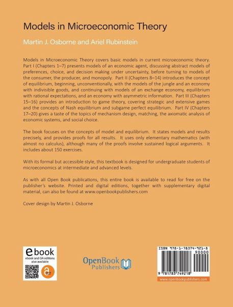 Models in Microeconomic Theory covers basic models in current microeconomic theory. Part I (Chapters 1-7) presents models of an economic agent, discussing abstract models of preferences, choice, and decision making under uncertainty, before turning to models of the consumer, the producer, and monopoly. Part II (Chapters 8-14) introduces the concept of equilibrium, beginning, unconventionally, with the models of the jungle and an economy with indivisible goods, and continuing with models of an exchange economy, equilibrium with rational expectations, and an economy with asymmetric information. Part III (Chapters 15-16) provides an introduction to game theory, covering strategic and extensive games and the concepts of Nash equilibrium and subgame perfect equilibrium. Part IV (Chapters 17-20) gives a taste of the topics of mechanism design, matching, the axiomatic analysis of economic systems, and social choice. The book focuses on the concepts of model and equilibrium. It states models and results precisely, and provides proofs for all results. It uses only elementary mathematics (with almost no calculus), although many of the proofs involve sustained logical arguments. It includes about 150 exercises. With its formal but accessible style, this textbook is designed for undergraduate students of microeconomics at intermediate and advanced levels. Throughout this book, the pronouns he/his are used.