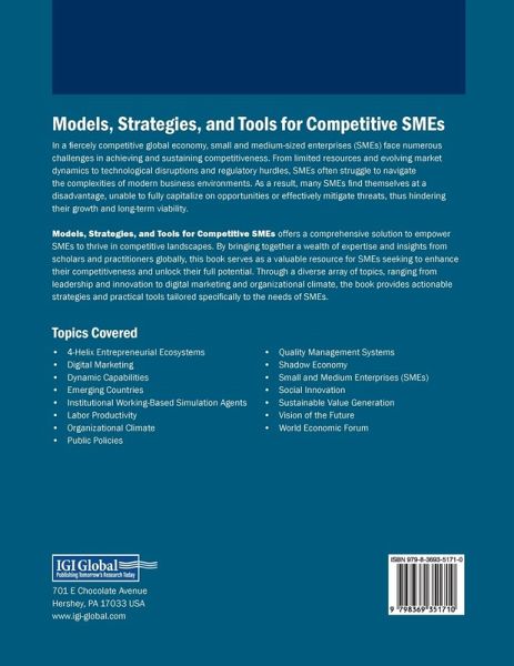 In a fiercely competitive global economy, small and medium-sized enterprises (SMEs) face numerous challenges in achieving and sustaining competitiveness. From limited resources and evolving market dynamics to technological disruptions and regulatory hurdles, SMEs often struggle to navigate the complexities of modern business environments. As a result, many SMEs find themselves at a disadvantage, unable to fully capitalize on opportunities or effectively mitigate threats, thus hindering their growth and long-term viability. Models, Strategies, and Tools for Competitive SMEs offers a comprehensive solution to empower SMEs to thrive in competitive landscapes. By bringing together a wealth of expertise and insights from scholars and practitioners globally, this book serves as a valuable resource for SMEs seeking to enhance their competitiveness and unlock their full potential. Through a diverse array of topics, ranging from leadership and innovation to digital marketing and organizational climate, the book provides actionable strategies and practical tools tailored specifically to the needs of SMEs.