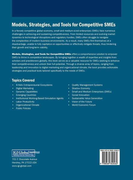 In a fiercely competitive global economy, small and medium-sized enterprises (SMEs) face numerous challenges in achieving and sustaining competitiveness. From limited resources and evolving market dynamics to technological disruptions and regulatory hurdles, SMEs often struggle to navigate the complexities of modern business environments. As a result, many SMEs find themselves at a disadvantage, unable to fully capitalize on opportunities or effectively mitigate threats, thus hindering their growth and long-term viability. Models, Strategies, and Tools for Competitive SMEs offers a comprehensive solution to empower SMEs to thrive in competitive landscapes. By bringing together a wealth of expertise and insights from scholars and practitioners globally, this book serves as a valuable resource for SMEs seeking to enhance their competitiveness and unlock their full potential. Through a diverse array of topics, ranging from leadership and innovation to digital marketing and organizational climate, the book provides actionable strategies and practical tools tailored specifically to the needs of SMEs.