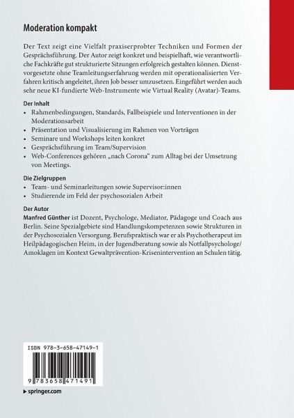 Der Text zeigt eine Vielfalt praxiserprobter Techniken und Formen der Gesprächsführung. Der Autor zeigt konkret und beispielhaft, wie verantwortliche Fachkräfte gut strukturierte Sitzungen erfolgreich gestalten können. Dienstvorgesetzte ohne Teamleitungserfahrung werden mit operationalisierten Verfahren kritisch angeleitet, ihren Job besser umzusetzen. Eingeführt werden auch sehr neue KI-fundierte Web-Instrumente wie Virtual Reality (Avatar)-Teams.