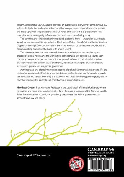 Modern Administrative Law in Australia provides an authoritative overview of administrative law in Australia. It clarifies and enlivens this crucial but complex area of law, with erudite analysis and modern perspectives. The contributors - including highly respected academics from eleven Australian law schools, as well as eminent practitioners including Chief Justice Robert French AC and Justice Stephen Gageler of the High Court of Australia - are at the forefront of current research, debate and decision making, and infuse the book with unique insight. The book examines the structure and themes of administrative law, the theory and practice of judicial review, and the workings of administrative law beyond the courts. Administrative law affects innumerable aspects of political, commercial and private life, and yet is often considered difficult to understand. Modern Administrative Law unravels the intricacies and reveals how they are applied in real cases. It is an essential reference for students and practitioners of administrative law.