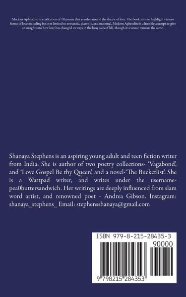 Modern Aphrodite is a collection of 18 poems that revolve around the theme of love. The book aims to highlight various forms of love including but not limited to romantic, platonic, and maternal. Modern Aphrodite is a humble attempt to give an insight into how love has changed its ways in the busy sails of life, though its essence remains the same.