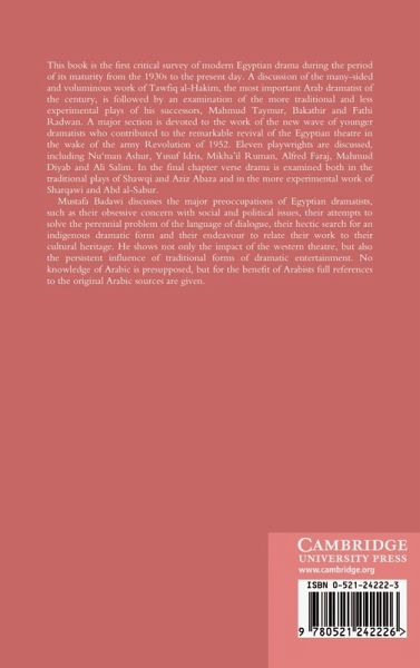 This book is the first critical survey of modern Egyptian drama during the period of its maturity from the 1930s to the present day. A discussion of the work of Tawfiq al-Hakim is followed by an examination of the less experimental plays of his successors, Mahmud Taymur, Bakathir and Fathi Radwan.