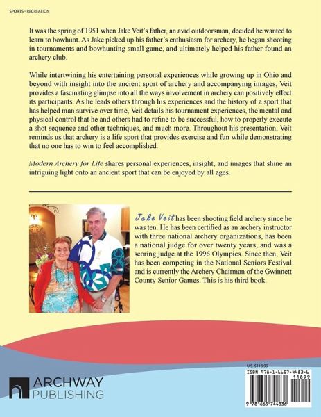 It was the spring of 1951 when Jake Veit's father, an avid outdoorsman, decided he wanted to learn to bowhunt. As Jake picked up his father's enthusiasm for archery, he began shooting in tournaments and bowhunting small game, and ultimately helped his father found an archery club. While intertwining his entertaining personal experiences while growing up in Ohio and beyond with insight into the ancient sport of archery and accompanying images, Veit provides a fascinating glimpse into all the ways involvement in archery can positively effect its participants. As he leads others through his experiences and the history of a sport that has helped man survive over time, Veit details his tournament experiences, the mental and physical control that he and others had to refine to be successful, how to properly execute a shot sequence and other techniques, and much more. Throughout his presentation, Veit reminds us that archery is a life sport that provides exercise and fun while demonstrating that no one has to win to feel accomplished. Modern Archery for Life shares personal experiences, insight, and images that shine an intriguing light onto an ancient sport that can be enjoyed by all ages.