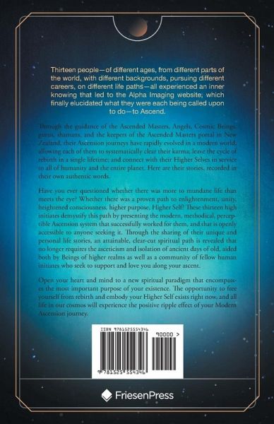 Thirteen people-of different ages, from different parts of the world, with different backgrounds, pursuing different careers, on different life paths-all experienced an inner knowing that led to the Alpha Imaging website, which finally elucidated what they were each being called upon to do-to Ascend. Through the guidance of the Ascended Masters, Angels, Cosmic Beings, gurus, shamans, and the keepers of the Ascended Masters portal in New Zealand, their Ascension journeys have rapidly evolved in a modern world, allowing each of them to systematically clear their karma; leave the cycle of rebirth in a single lifetime; and connect with their Higher Selves in service to all of humanity and the entire planet. Here are their stories, recorded in their own authentic words. Have you ever questioned whether there was more to mundane life than meets the eye? Whether there was a proven path to enlightenment, unity, heightened consciousness, higher purpose, Higher Self? These thirteen high initiates demystify this path by presenting the modern, methodical, perceptible Ascension system that successfully worked for them, and that is openly accessible to anyone seeking it. Through the sharing of their unique and personal life stories, an attainable, clear-cut spiritual path is revealed that no longer requires the asceticism and isolation of ancient days of old, aided both by Beings of higher realms as well as a community of fellow human initiates who seek to support and love you along your ascent. Open your heart and mind to a new spiritual paradigm that encompasses the most important purpose of your existence. The opportunity to free yourself from rebirth and embody your Higher Self exists right now, and all life in our cosmos will experience the positive ripple effect of your Modern Ascension journey.