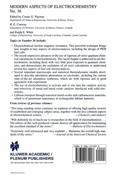 This volume of Modern Aspects contains a remarkable spread of topics covered in an authoritative manner by some internationally renowned specialists. In a seminal chapter Drs. Babu, Oldfield and Wieckowski demonstrate eloquently the strength of electrochemical nuclear magnetic resonance (EC-NMR) to study in situ both sides of the electrochemical interface via the simultaneous use of and This powerful non-invasive technique brings new insights to both fundamental and practical key aspects of electrocatalysis, including the design of better anodes for PEM fuel cells. The recent impressive advances in the use of rigorous ab initio quantum chemical calculations in electrochemistry are described in a remarkable chapter by Marc Koper, one of the leading protagonists in this fascinating area. This lucid chapter is addressed to all electrochemists, including those with very little prior exposure to quantum chemistry, and demonstrates the usefulness of ab initio calculations, including density functional theory (DFT) methods, to understand several key aspects of fuel cell electrocatalysis at the molecular level. The most important macroscopic and statistical thermodynamic models developed to describe adsorption phenomena on electrodes are presented critically in a concise and authoritative chapter by Panos Nikitas. The reader is guided through the seminal contributions of Frumkin, Butler, Bockris, Guidelli and others, to the current state of the art adsorption isotherms, which are both rigorous, and in good agreement with experiment.