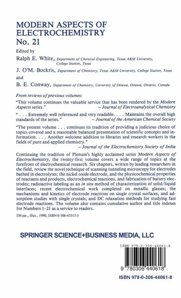 1 Analysis of the Capacitance of the Metal- Solution Interface: Role of the Metal and the Metal-Solvent Coupling.- I. Introduction.- II. General Aspects.- III. Electronic Properties of the Metal Surface.- IV. Metal-Adsorbate Interactions.- V. General Structure of Recent Models for the Capacitance.- VI. Models with Fixed Metal-Solvent Distance.- VII. Models with Variable Metal-Solvent Distance.- VIII. A Semiempirical Approach.- IX. Conclusion.- Appendix. Evaluation of Uvdw.- References.- 2 Electrocatalytic Oxidation of Oxygenated Aliphatic Organic Compounds at Noble Metal Electrodes.- I. Introduction.- II. Experimental Methods.- III. Selected Examples.- IV. Outlook for the Oxidation of Small Organic Molecules at Catalytic Electrodes.- References.- 3 Surface States on Semiconductors.- I. Introduction.- II. Models of the Potential Distribution at the Surface.- III. Surface States at the Semiconductor/Vacuum Interface.- IV. Surface States and Electrochemical Behavior in the Dark.- V. Photocurrents at Semiconductor Electrodes.- VI. Fermi Level Pinning in Electrochemistry.- VII. The Characterization of Surface States.- VIII. Conclusions.- References.- 4 Electrodeposition of Nickel-Iron Alloys.- I. Introduction.- II. Phenomenology of Ni-Fe Alloy Electrodeposition.- III. The Effect of the Electrodeposition Conditions on the Composition of Ni-Fe Alloys.- IV. The Effect of a Periodically Changing Rate on the Electrodeposition of Nickel-Iron Alloys.- V. The Properties of the Electrodeposited Ni-Fe Alloys.- VI. Electrochemical Behavior of Electrodeposited Ni-Fe Alloys.- VII. Conclusions.- References.- 5 Microelectrode Techniques in Electrochemistry.- I. Introduction.- II. Fundamentals.- III. Applications.- IV. Conclusion.- References.- Cumulative Author Index.- Cumulative Title Index.