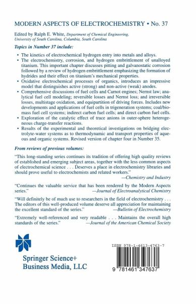 This volume of Modern Aspects contains seven chapters. The major topics covered in the first six chapters of this volume include fundamentals of solid state electrochemistry; kinetics of electrochemical hydrogen entry into metals and alloys; oxidation of organics; fuel cells; electrode kinetics of trace-anion catalysis; nano structural analysis. The last chapter is a corrected version of chapter four from Volume 35. Faisal M. AI-faqeer and Howard W. Pickering begin the first chapter by going back to 1864 and Cailletet who found that some hydrogen evolved and was absorbed by iron when it was immersed in dilute sulfuric acid. The absorption of hydrogen into metals and alloys can lead to catastrophic failures of structures. They discuss the kinetics of electrochemical hydrogen entry into metals and alloys. In chapter three, Clyde L. Briant reviews the electrochemistry, corrosion and hydrogen embrittlement of unalloyed titanium. He begins by reviewing the basic electrochemistry and general corrosion of titanium. He also discusses pitting and galvanostatic corrosion followed by a review of hydrogen embrittlement emphasizing the formation of hydrides and the effect of these on titanium's mechanical properties. Christos Comninellis and Gy6rgy F6ti discuss the oxidative electrochemical processes of organics in chapter three. They begin by defining direct and indirect electrochemical oxidation of organics. They introduce a model that allows them to distinguish between active (strong) and non-active (weak) anodes. Different classes of organic compounds are used for kinetic models of organic oxidation at active and non-active type anodes.