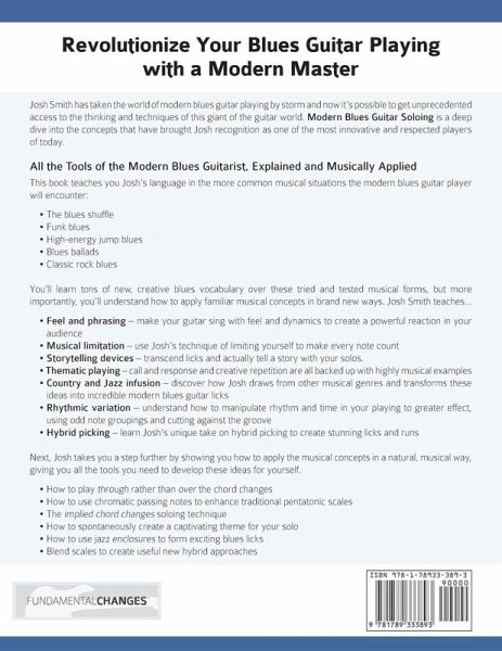 Revolutionize Your Blues Guitar Playing with Josh Smith "Josh Smith is one of my favorite musicians on the planet. His musical depth and guitar playing transcend the boundaries of the blues genre into a genre of his own." Joe Bonamassa Josh Smith has taken the world of modern blues guitar playing by storm and now it's possible to get unprecedented access to the thinking and techniques of this giant of the guitar world. Modern Blues Guitar Soloing is a deep dive into the concepts that have brought Josh recognition as one of the most innovative and respected players of today. All the Tools of the Modern Blues Guitarist, Explained and Musically Applied This book teaches you Josh's language in the more common musical situations the modern blues guitar player will encounter: The blues shuffleFunk bluesHigh-energy jump bluesBlues balladsClassic rock blues You'll learn tons of new, creative blues vocabulary over these tried and tested musical forms, but more importantly, you'll understand how to apply familiar musical concepts in brand new ways. Josh Smith Teaches Feel and phrasing - make your guitar sing with feel and dynamics to create a powerful reaction in your audienceMusical limitation - use Josh's technique of limiting yourself to make every note countStorytelling devices - transcend licks and actually tell a story with your solos.Thematic playing - call and response and creative repetition are all backed up with highly musical examplesCountry and Jazz infusion - discover how Josh draws from other musical genres and transforms these ideas into incredible modern blues guitar licksRhythmic variation - understand how to manipulate rhythm and time in your playing to greater effect, using odd note groupings and cutting against the grooveHybrid picking - learn Josh's unique take on hybrid picking to create stunning licks and runs