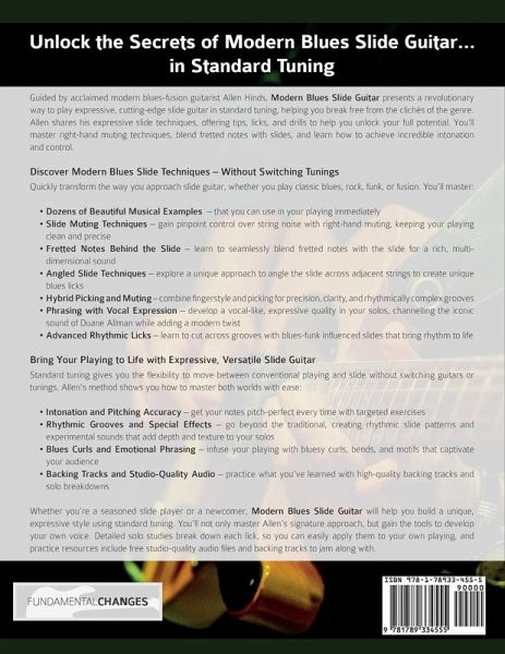 Unlock the Secrets of Modern Blues Slide Guitar... in Standard Tuning Want to seamlessly switch between slide and regular playing without retuning? Ready to master modern blues with a unique, versatile approach? Guided by the acclaimed modern blues-fusion guitarist Allen Hinds, Modern Blues Slide Guitar presents a revolutionary way to play expressive, cutting-edge slide guitar in standard tuning, helping you break free from the clichés of the genre. In Modern Blues Slide Guitar, Allen shares his most expressive slide techniques, offering tips, licks, and drills to help you unlock your full potential. You'll master right-hand muting techniques, blend fretted notes with slides, and learn how to achieve incredible intonation and control. Discover Modern Blues Slide Techniques-Without Switching Tunings You'll quickly transform the way you approach slide guitar, whether you're playing classic blues, rock, funk, or fusion. You'll master: Dozens of Beautiful Musical Examples - That you can use in your playing immediately Slide Muting Techniques - Gain pinpoint control over string noise with right-hand muting, keeping your playing clean and precise. Fretted Notes Behind the Slide - Learn to seamlessly blend fretted notes with the slide for a rich, multi-dimensional sound. Angled Slide Techniques - Explore a unique approach to angle the slide across adjacent strings to create unique blues licks. Hybrid Picking and Muting - Combine fingerstyle and picking for precision, clarity, and rhythmically complex grooves. Phrasing with Vocal Expression - Develop a vocal-like, expressive quality in your solos, channelling the iconic sound of Duane Allman while adding a modern twist. Advanced Rhythmic Licks - Learn to cut across grooves with blues-funk influenced slides that bring rhythm to life. Bring Your Playing to Life with Expressive, Versatile Slide Guitar Standard tuning gives you the flexibility to move between conventional playing and slide without switching guitars or tunings. Allen's method shows you how to master both worlds with ease: Intonation and Pitching Accuracy - Get your notes pitch-perfect every time with targeted exercises. Rhythmic Grooves and Special Effects - Go beyond the traditional, creating rhythmic slide patterns and experimental sounds that add depth and texture to your solos. Blues Curls and Emotional Phrasing - Infuse your playing with bluesy curls, bends, and motifs that captivate any audience. Backing Tracks and Studio-Quality Audio - Practice what you've learned with high-quality backing tracks and solo breakdowns.