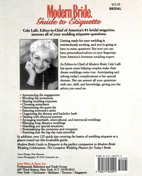 Modern Bride Guide to Etiquette Cele Lalli, Editor-in-Chief of America's #1 bridal magazine, answers all of your wedding etiquette questions. Getting ready for your wedding is tremendously exciting, and you're going to have so many questions! But now you can have personalized advice at your fingertips from America's foremost wedding expert. As Editor-in-Chief of Modern Bride, Cele Lalli has spent years helping couples make their dream weddings come true. Anticipating and solving today's complications is her special domain. She can answer all your questions with tact, skill, and knowledge, giving you the advice you need on: * Announcing the engagement * Wording the invitations * Sharing wedding expenses * Choosing attendants * Determining the guest list * Selecting everyone's attire * Organizing the shower and bachelor bash * Dealing with divorced parents * Arranging interfaith, intercultural, and interracial weddings * Planning long distance weddings * Handling any special situations * Personalizing the ceremony and reception * Ensuring that the big day runs smoothly In addition, over 125 quick tips covering the basics of wedding etiquette at a glance round out this invaluable guide. Modern Bride Guide to Etiquette is the perfect companion to Modern Bride Wedding Celebrations: The Complete Wedding Planner for Today's Bride.