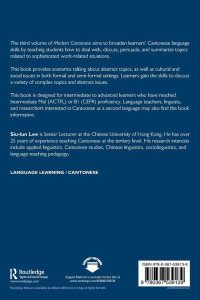 The third volume of Modern Cantonese aims to broaden learners' Cantonese language skills by teaching students how to deal with, discuss, persuade, and summarize topics related to sophisticated work-related situations.