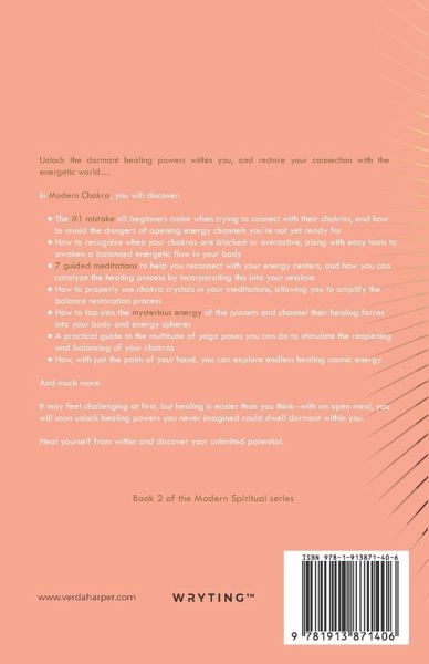 Unlock the dormant healing powers within you, and restore your connection with the energetic world... At some point during our development as a species, we experienced a huge shift in the paradigm of existence--from living in harmony with the planet and all its wealth, to fighting against those same things that should bring us peace and harmony. Ultimately, the fight turned against us. It didn't take long for humanity to transform the world we live in entirely. We have developed a general state of detachment that only draws us further apart and encourages us to be more disconnected from ourselves and our surroundings. It may come as no surprise then, that almost half of the adult population experience one or more forms of mental illness in their lifetime. It is even less surprising that the more we indulge in this detachment from ourselves, the more that number increases. This hasn't always been the case, however. For a very long time, Eastern philosophy held the key to our wellbeing--and with the right tools, we can easily uncover their secrets for a better life. If you've been feeling stiff, unemotional, closed off to others, lacking self-esteem, or have even found yourself in an abusive relationship, then you might have a blocked energy center unbalancing the flow of all the other energy centers in your body or chakras. We have 7 chakras located at different areas in the body that are responsible for our health and general wellbeing--for us to be healthy, those energies need to flow unhindered along our spine. If one of them is blocked, it causes all the others to be in a state of imbalance, which can manifest in all kinds of physical and mental health problems. However, unblocking them is easy. All it takes is for you to be open to explore, tapping into energies long forgotten to finally heal yourself from within and reconnect with a lost sense of universal self. In Modern Chakra, you will discover: The #1 mistake all beginners make when trying to connect with their chakras, and how to avoid the dangers of opening energy channels you're not yet ready for How to recognize when your chakras are blocked or overactive, along with easy tools to awaken a balanced energetic flow in your body 7 guided meditations to help you reconnect with your energy centers, and how you can catalyze the healing process by incorporating this into your sessions How to properly use chakra crystals in your meditations, allowing you to amplify the balance restoration process How to tap into the mysterious energy of the planets and channel their healing forces into your body and energy spheres A practical guide to the multitude of yoga poses you can do to stimulate the reopening and balancing of your chakras How, with just the palm of your hand, you can explore endless healing cosmic energy And much more. With the right tools, comprehensive knowledge, and proper guidance, you will finally be able to tap into your life's energy and reconnect to the world the way you were meant to. It may feel challenging at first, but healing is easier than you think--with an open mind, you will soon unlock healing powers you never imagined could dwell dormant within you.