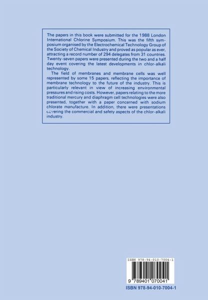 The papers in this book were submitted for the 1988 London International Chlorine Symposium. This was the fifth symposium organised by the Electro chemical Technology Group of the Society of Chemical Industry and proved as popular as ever, attracting a record number of 294 delegates from 31 countries. Twenty-seven papers were presented during the two and a half-day event covering the latest developments in chlor-alkali technology. The field of membranes and membrane cells was well represented by some 15 papers, reflecting the importance of membrane technology to the future of the industry. This is particularly relevant in view of increasing environmental pressures and rising costs. However, papers relating to the more traditional mercury and diaphragm cell technologies were also presented, together with a paper concerned with sodium chlorate manufacture. In addition, there were presentations covering the commercial and safety aspects of the chlor-alkali industry. The Electrochemical Technology Group of the Society of Chemical Industry offer thanks to the many people and organisations whose help ensured the success of this symposium. In particular, we would like to thank: 1. The contributors of the papers. 2. The session chairmen: Dr R. G. Smerko (The Chlorine Institute Inc.); Mr B. Lott (The Associated Octel Company Limited); Mr T. F. O'Brien (United Engineers and Constructors); Dr B. S. Gilliatt (ICI Chemicals and Polymers Limited); Mr D. Bell (Hays Chemicals Limited). 3. The Chlorine Institute for assistance with printing costs and for active participation.
