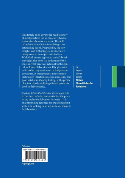 This timely book covers the need to know clinical practices for all those involved in molecular laboratory science. The field of molecular medicine is evolving at an astounding speed. Propelled by the new insights and technologies, advances are being made at an unprecedented rate. With dual measure given to today's breakthroughs, this book is a collection of the most current practices relevant to the clinical molecular laboratorian. It begins with an introductory section on techniques and procedure. It then presents four separate sections on infectious disease, oncology, pre/post-natal, and identity testing, with specific chapters clearly outlining clinical protocols used in daily practice.
