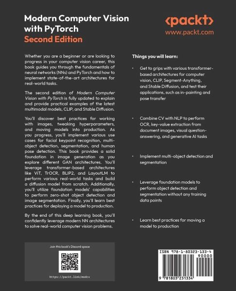 The definitive computer vision book is back, featuring the latest neural network architectures and an exploration of foundation and diffusion models Purchase of the print or Kindle book includes a free eBook in PDF format Key Features - Understand the inner workings of various neural network architectures and their implementation, including image classification, object detection, segmentation, generative adversarial networks, transformers, and diffusion models - Build solutions for real-world computer vision problems using PyTorch - All the code files are available on GitHub and can be run on Google Colab Book Description Whether you are a beginner or are looking to progress in your computer vision career, this book guides you through the fundamentals of neural networks (NNs) and PyTorch and how to implement state-of-the-art architectures for real-world tasks. The second edition of Modern Computer Vision with PyTorch is fully updated to explain and provide practical examples of the latest multimodal models, CLIP, and Stable Diffusion. You'll discover best practices for working with images, tweaking hyperparameters, and moving models into production. As you progress, you'll implement various use cases for facial keypoint recognition, multi-object detection, segmentation, and human pose detection. This book provides a solid foundation in image generation as you explore different GAN architectures. You'll leverage transformer-based architectures like ViT, TrOCR, BLIP2, and LayoutLM to perform various real-world tasks and build a diffusion model from scratch. Additionally, you'll utilize foundation models' capabilities to perform zero-shot object detection and image segmentation. Finally, you'll learn best practices for deploying a model to production. By the end of this deep learning book, you'll confidently leverage modern NN architectures to solve real-world computer vision problems. What you will learn - Get to grips with various transformer-based architectures for computer vision, CLIP, Segment-Anything, and Stable Diffusion, and test their applications, such as in-painting and pose transfer - Combine CV with NLP to perform OCR, key-value extraction from document images, visual question-answering, and generative AI tasks - Implement multi-object detection and segmentation - Leverage foundation models to perform object detection and segmentation without any training data points - Learn best practices for moving a model to production Who this book is for This book is for beginners to PyTorch and intermediate-level machine learning practitioners who want to learn computer vision techniques using deep learning and PyTorch. It's useful for those just getting started with neural networks, as it will enable readers to learn from real-world use cases accompanied by notebooks on GitHub. Basic knowledge of the Python programming language and ML is all you need to get started with this book. For more experienced computer vision scientists, this book takes you through more advanced models in the latter part of the book. Table of Contents - Artificial Neural Network Fundamentals - PyTorch Fundamentals - Building a Deep Neural Network with PyTorch - Introducing Convolutional Neural Networks - Transfer Learning for Image Classification - Practical Aspects of Image Classification - Basics of Object Detection - Advanced Object Detection - Image Segmentation - Applications of Object Detection and Segmentation - Autoencoders and Image Manipulation - Image Generation Using GANs (N.B. Please use the Read Sample option to see further chapters)