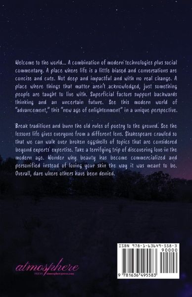 Welcome to the world... A combination of modern technologies plus social commentary. A place where life is a little biased and conversations are concise and cute. Not deep and impactful and with no real change. A place where things that matter aren't acknowledged, just something people are taught to live with. Superficial factors support backwards thinking and an uncertain future. See this modern world of "advancement", this "new age of enlightenment" in a unique perspective. Break traditions and burn the old rules of poetry to the ground. See the lessons life gives everyone from a different lens. Shakespeare crawled so that we can walk over broken eggshells of topics that are considered beyond experts' expertise. Take a terrifying trip of discovering love in the modern age. Wonder why beauty has become commercialized and personified instead of loving your skin the way it was meant to be. Overall, dare where others have been denied.