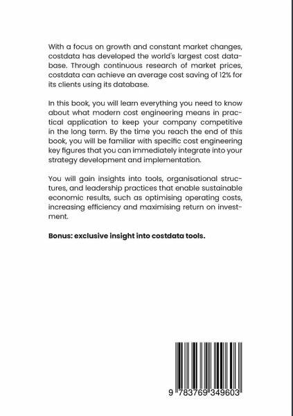 With a focus on growth and constant market changes, costdata has developed the world's largest cost database. Through continuous research of market prices, costdata can achieve an average cost saving of 12% for its clients using its database. In this book, you will learn everything you need to know about what modern cost engineering means in practical application to keep your company competitive in the long term. By the time you reach the end of this book, you will be familiar with specific cost engineering key figures that you can immediately integrate into your strategy development and implementation. You will gain insights into tools, organisational structures, and leadership practices that enable sustainable economic results, such as optimising operating costs, increasing efficiency and maximising return on investment. Bonus: exclusive insight into costdata tools.