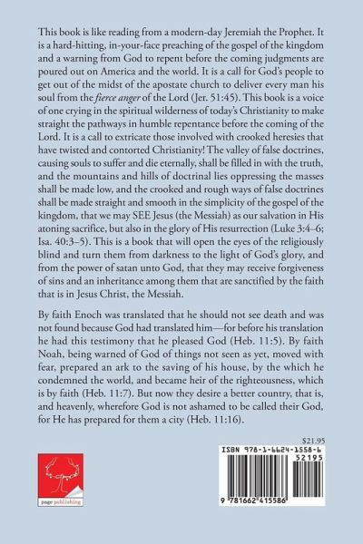 2 This book is like reading from a modern-day Jeremiah the Prophet. It is a hard-hitting, in-your-face preaching of the gospel of the kingdom and a warning from God to repent before the coming judgments are poured out on America and the world. It is a call for God's people to get out of the midst of the apostate church to deliver every man his soul from the fierce anger of the Lord (Jer. 51:45). This book is a voice of one crying in the spiritual wilderness of today's Christianity to make straight the pathways in humble repentance before the coming of the Lord. It is a call to extricate those involved with crooked heresies that have twisted and contorted Christianity! The valley of false doctrines, causing souls to suffer and die eternally, shall be filled in with the truth, and the mountains and hills of doctrinal lies oppressing the masses shall be made low, and the crooked and rough ways of false doctrines shall be made straight and smooth in the simplicity of the gospel of the kingdom, that we may SEE Jesus (the Messiah) as our salvation in His atoning sacrifice, but also in the glory of His resurrection (Luke 3:4-6; Isa. 40:3-5). This is a book that will open the eyes of the religiously blind and turn them from darkness to the light of God's glory, and from the power of satan unto God, that they may receive forgiveness of sins and an inheritance among them that are sanctified by the faith that is in Jesus Christ, the Messiah. By faith Enoch was translated that he should not see death and was not found because God had translated him-for before his translation he had this testimony that he pleased God (Heb. 11:5). By faith Noah, being warned of God of things not seen as yet, moved with fear, prepared an ark to the saving of his house, by the which he condemned the world, and became heir of the righteousness, which is by faith (Heb. 11:7). But now they desire a better country, that is, and heavenly, wherefore God is not ashamed to be called their God, for He has prepared for them a city (Heb. 11:16).