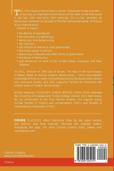 Philip, King of Macedon, was wont to boast that he could take any city into which he could drive an ass laden with gold. Many statesmen from Philip's time down to our own have spoken to the like effect. So long as private property exists, there will be rich men ready to corrupt, and other men, rich as well as poor, ready to he corrupted, for "the love of money is the root of all evil." This has been so under all forms of government alike. The House of Commons in the days when Walpole, looking round its benches, observed, "All these men have their price," was no worse than were most of the Jacobin leaders among the French revolutionaries... s-from Chapter LXIX: "The Money Power in Politics" This 1921 study of democracy in action-presented in two volumes-is not only an important examination of the state of the free world in the late 19th and early 20th centuries, it's a vital reminder, as democracy continues to struggle to fruition around the globe, of history as an ongoing story. Volume II covers: the decline of legislatures the executive in a democracy democracy and foreign policy the judiciary the relation of central to local government the money power in politics democracy compared with other forms of government the future of democracy and democracy at work in the United States, Australia, and New Zealand. In 1921, William H. Taft said of Bryce, "no man in the world today is better fitted to discuss modern democracies... [His] encyclopedic knowledge of history, made vivid and practical by his actual observations and continued studies, give him a peculiar facility for discussing the present state of modern democracies." British historian VISCOUNT JAMES BRYCE (1838-1922) attended the University of Glasgow and Trinity College, Oxford. He is best known for his scholarship of the Holy Roman Empire. His popular works include Studies in History and Jurisprudence (1901) and Studies in Contemporary Biography (1903).